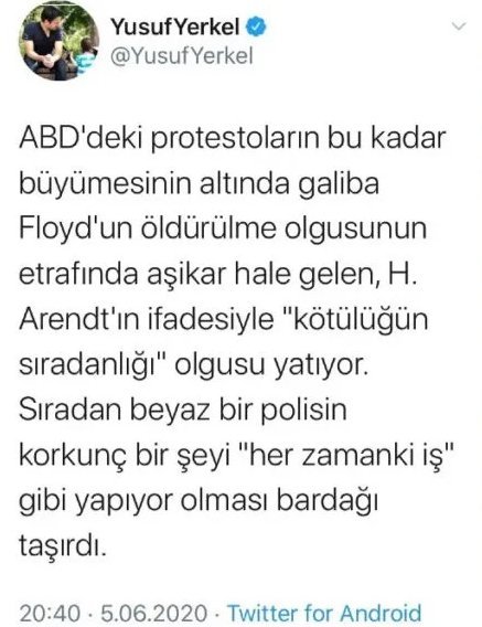 Yusuf Yerkel geçen yıl ABD'de siyahi George Floyd'un polis tarafından öldürülmesinin ardından Twitter sayfasında yayımladığı mesajı üzerine sosyal medyada bir hayli tepki görmüştü.