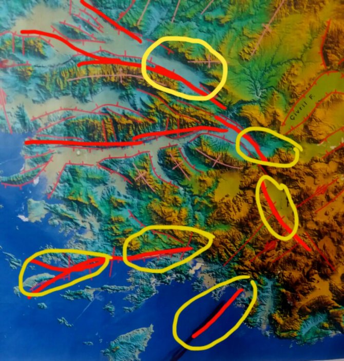 Diğeri de Rodos çanağının devamı olan Fethiye Körfezi’ne doğru giden fay hattıdır. Bu fay hatları ve bu iskelet fay yapısı Batı Anadolu’da ve Akdeniz’de sürekli olan depremlerin ana şemasını oluşturmaktadır. Bu iskeleti oluşturan yapıları kavradığımız zaman depremlerin nasıl bir süreç işlediğini görmekteyiz.