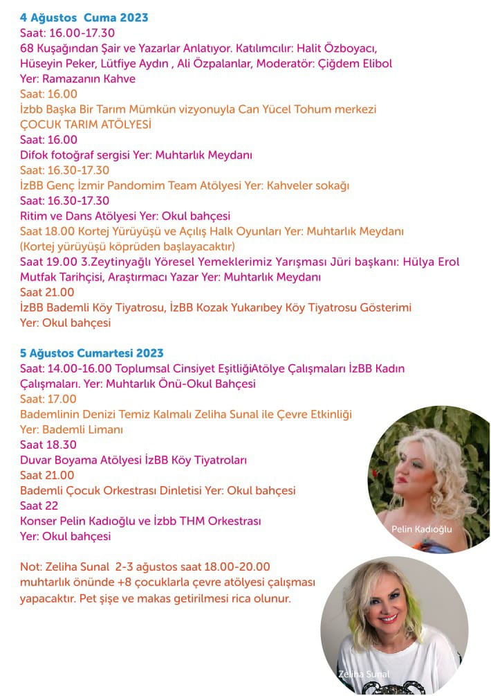 Çeşitli yazarlarla köy kahvesinde söyleşiler, fotoğraf sergileri, pantomim gösterileri, halk oyunları, yemek yarışması, toplumsal cinsiyet eşitliği atölye çalışması, duvar boyama atölyesi, çocuk orkestrası dinletisi, İzmir BB. Türk halk müziği konseri gibi etkinliklerle dolu festivalde ayrıca Bademli Köy Tiyatrosu ve Kozak Yukarıbey Tiyatrosu da oyunlarını sahneleyecek.