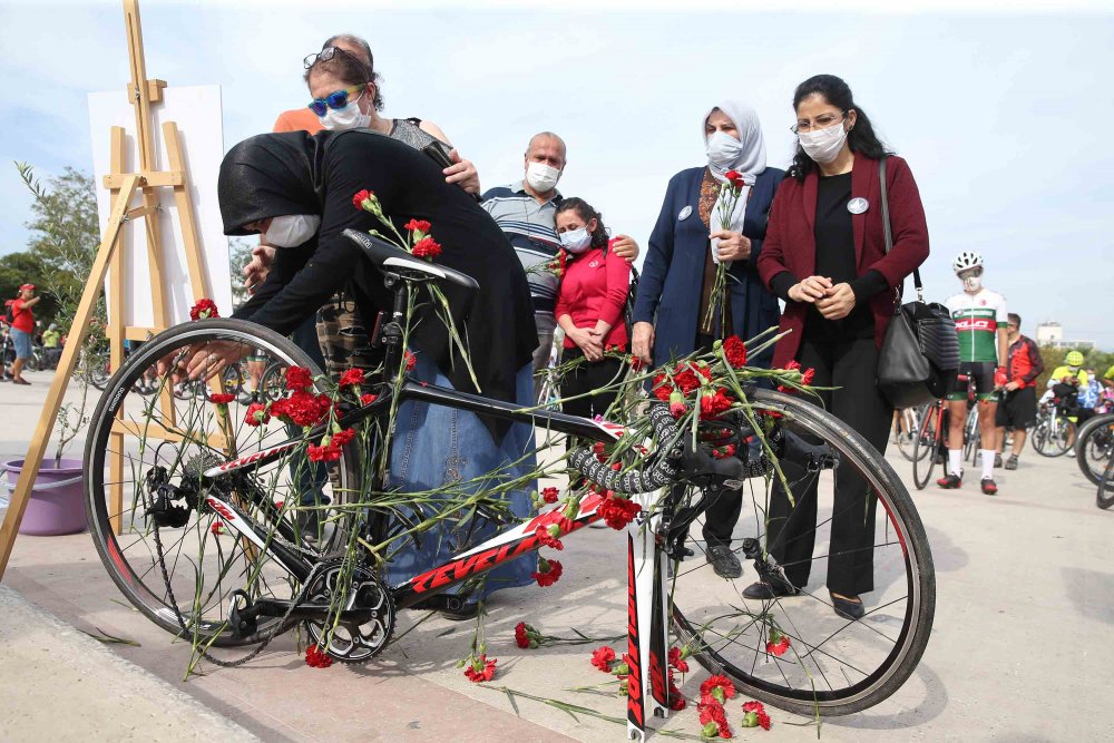Zeynep Aslan’ın kaza geçirdiği bisikleti üzerine sporcular tarafından karanfil bırakıldı.