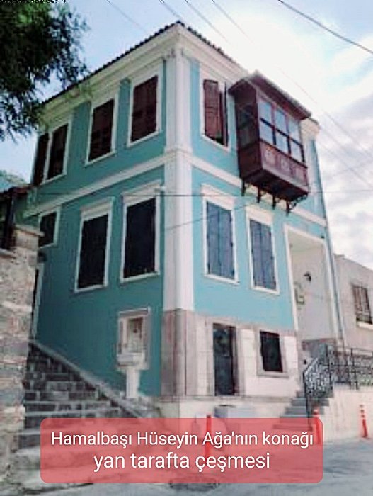 Hele yanındaki tarihi Konağın, 19 yy. da İzmir limanı Hamalbaşısı Hüseyin Ağa’ya ait olması ilginçtir. Hüseyin Ağa, konağı yaptırmış ama hemen camiye bakan yüzüne de erken rahmet eden kızı adına çeşme hayretmiş. Kitabesini okutunca ilgim bu sokağa daha da arttı. Kitabe de: Frenk Gümrüğü Hamalbaşı Hüseyin Ağa, bu suyu insanlık adına ulaştıran ve bu çeşmeyi Kızı merhume Havva hanımın ruhu için inşa eyleyendir. Bilhassa bal şerbeti tadındaki bu suyu, hayırlara vesile olması adına bu kurnaya akıttı. (1899) Ağa konusunda bir not düşmek istiyorum: Daha önceleri okuduğum belgede Hamalbaşı Hüseyin Ağa İzmir Frenk gümrüğünü 6000 altın karşılığı saraydan kiralamış. Yaz aylarını da Foça da geçirirmiş.