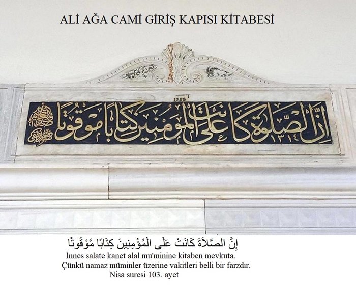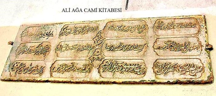 Not: Bu kitabeden şunu da anlıyoruz ki Ali Ağa Camii çeşmesiyle, Medresesiyle ve haziresiyle birlikte külliye olarak inşa edilmiştir; ancak bugün medrese ve çeşme den eser yok.