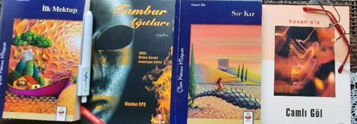 2 yazar “Hasan Efe” ve eşi “Vicdan Efe,” 4 kitap “İlk Mektup, Sır Kız, Camlı Göl” Hasan Efenin “Tambur Ağıtları” ise Vicdan Efenin eserleri.