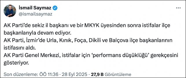 Gazeteci İsmail Saymaz sosyal medya hesabından yaptığı paylaşımda, "AK Parti’de sekiz il başkanı ve bir MKYK üyesinden sonra istifalar ilçe başkanlarıyla devam ediyor. AK Parti, İzmir’de Urla, Kınık, Foça, Dikili ve Balçova ilçe başkanlarının istifasını aldı" bilgisini paylaştı.