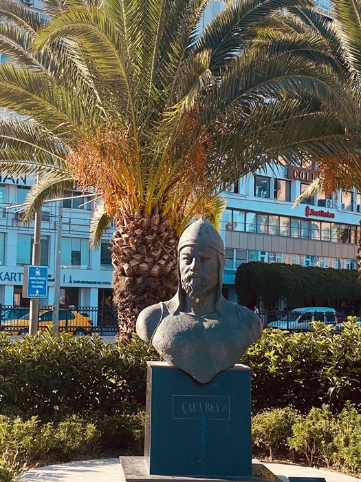 Yaya geçidinin deniz tarafındaki çıkışında kentin önemli adlarından olan Çaka Bey’in anıtı vardır.
