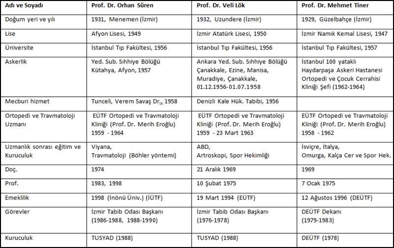 Prof. Dr. Orhan Süren iki dönem (1986-1988, 1988-1990), Prof. Dr. Veli Lök bir dönem (1976-1978) İzmir Tabib Odası Başkanlığı yapmışlar ve İzmir’de Türkiye Spor Yaralanmaları ve Artroskopi Derneği (TUSYAD, 1988)’nin kuruluşunu gerçekleştirmişlerdir (9,10) (Tablo I).
