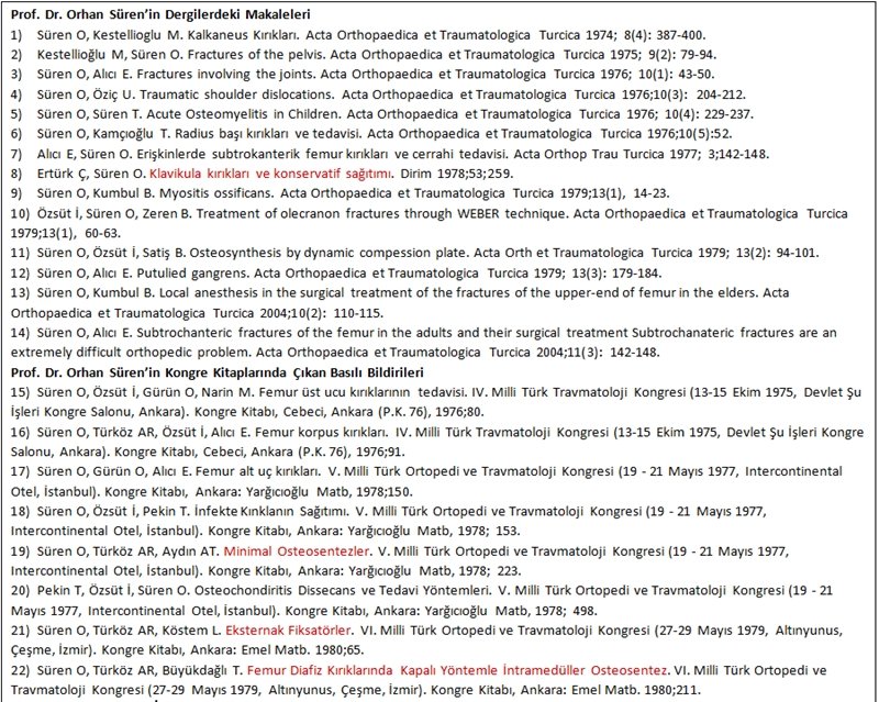 Bilimsel yayınları: Prof. Dr. Orhan Süren, bilimsel alanda da pek çok bilimsel makaleler yayınlamıştır. Bunlardan bazıları aşağıdaki Tablo I’de gösterilmiştir. Bu makaleler incelendiğinde, Proof. Dr. Orhan Süren, “minimal cerrahi” girişim ve “kapalı yöntem” ile travmatik kırıkların sağaltımı için çalışmalar ve uygulamalar yaptığı görülmektedir (Tablo II).
