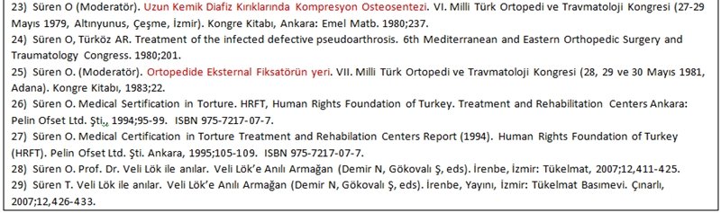 - Süren O. Medical Certification in Torture Treatment and Rehabilation Centers Report (1994). Human Rights Foundation of Turkey (HRFT). Ankara: Pelin Ofset Ltd. Şti. 1995;105-109. ISBN 975-7217-07-7.