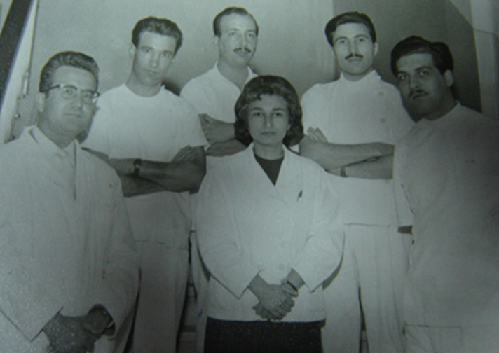 Fotoğ. 5. Doç Dr. Merih (Gölcüklü) Eroğlu ve Opr. Dr. Sebahattin Özberk, Dr. Orhan Süren, Dr. Mehmet Tiner, Dr. Veli Lök, Dr. Ünalan Eraltuğ (Dr. Behçet Uz Çocuk Hastanesi, 1962).