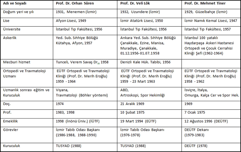 Tablo I. İzmirli Prof. Dr. Orhan Süren ve dönem arkadaşları Prof. Dr. Veli Lök ve Prof. Dr. Mehmet Tiner’in bazı özellikleri (10,11).
