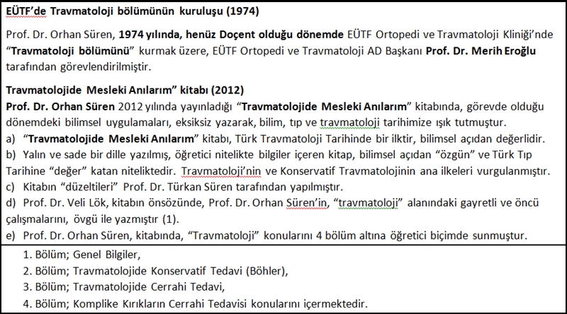 – Prof. Dr. Orhan Süren’in emekli olduktan sonraki yıllar içinde yazmış olduğu ve 2012 yılında yayınladığı “Travmatolojide Mesleki Anılarım” kitabının içeriği, son derece “bilimsel” özelliktedir (1).