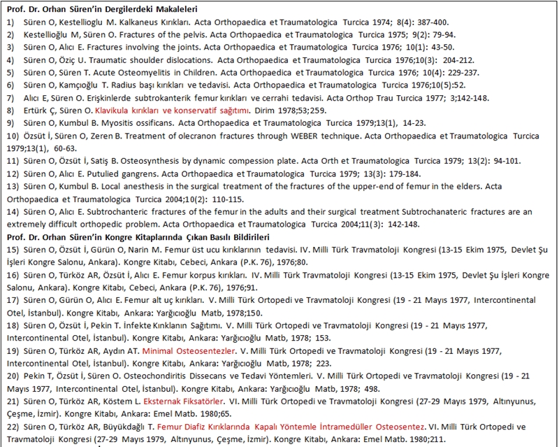 Bilimsel yayınları: Prof. Dr. Orhan Süren, bilimsel alanda da pek çok bilimsel makaleler yayınlamıştır. Bunlardan bazıları aşağıdaki Tablo I’de gösterilmiştir. Bu makaleler incelendiğinde, Proof. Dr. Orhan Süren, “minimal cerrahi” girişim ve “kapalı yöntem” ile travmatik kırıkların sağaltımı için çalışmalar ve uygulamalar yaptığı görülmektedir (Tablo II).