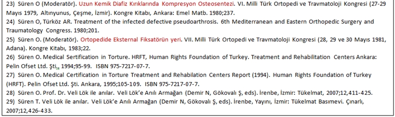 - Süren O. Medical Certification in Torture Treatment and Rehabilation Centers Report (1994). Human Rights Foundation of Turkey (HRFT). Ankara: Pelin Ofset Ltd. Şti. 1995;105-109. ISBN 975-7217-07-7.