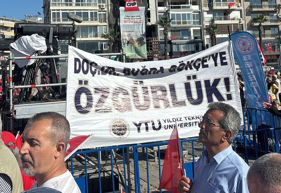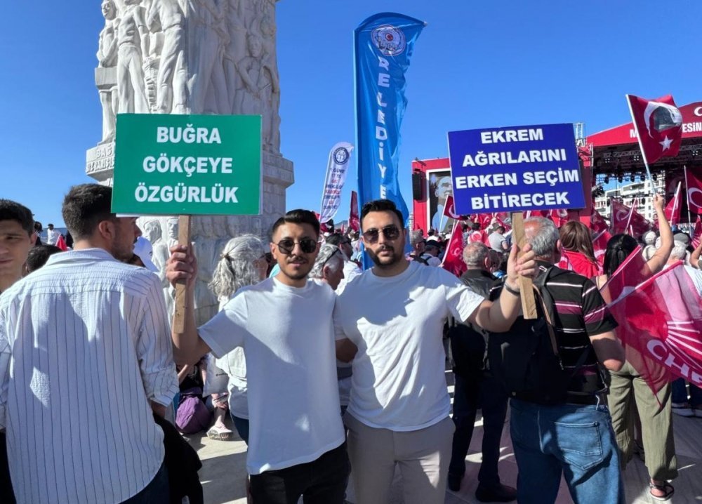 Mitingine katılan İzmirlilerde Gökçe’yi unutmadı ve Gündoğdu meydanına ellerinde ‘Doç. Dr. Buğra Gökçe’ye Özgürlük’ pankartları ile geldiler. CHP Genel Başkanı Özgür Özel’in katıldığı mitingde zaman zaman ‘Buğra Gökçe’ sloganları da duyuldu.