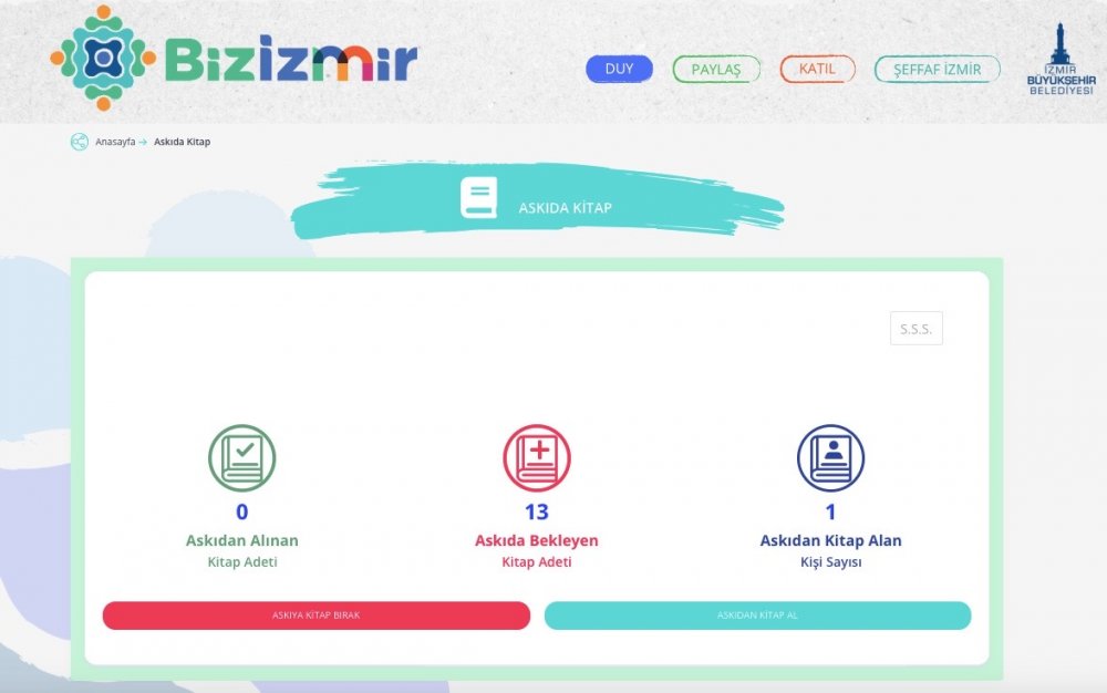 Türkiye’de ilk olan Askıda Kitap projesi, İzmir Büyükşehir Belediyesi'nin kurduğu www.halkinkitapcisi.com internet sitesi üzerinden yürütülecek. Kampanya kapsamında kitap almak için başvurular ise Biz İzmir dijital platformu üzerinden yapılacak. Kampanyaya destek olanlar ve kampanyadan yararlanmak isteyenler Biz İzmir dijital platformundan tek tıkla www.halkinkitapcisi.com’a yönlendirilecek.