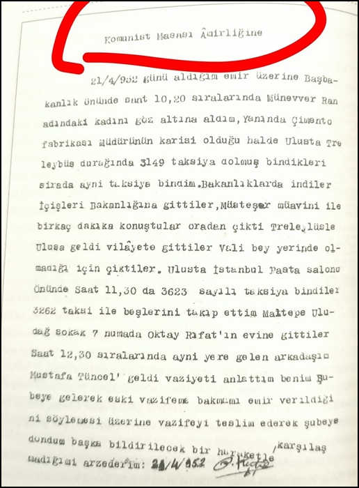 "bu gün ise (29-5-937 cumartesi) saat 10-30 da otelden çıkarak alelacele halk partisine girip başkâtip ziya ile bir saat görüştükten sonra saat 11-30 da filmci kenan ile birlikte dışarı çıkıp çok samimi surette konuşa konuşa İpekiş mağazasına gelerek elbiselik bir kumaşın fiyatını sorduktan sonra çıkıp burada Kenan’dan ayrılarak Yenişehir otobüsüne binerek doğruca yukarıda arz ettiğim merhum saylavın evine gittiği ve burada öğle yemeğini yedikten sonra bu saylavın oğlu ve adının Oktay(Oktay Rıfat) olduğu öğrenilen bir gençle saat 15-15 de evden çıkıp otobüsle Taşhana indikleri ve oradan doğruca maçı seyretmek üzere stadyuma inerek…"