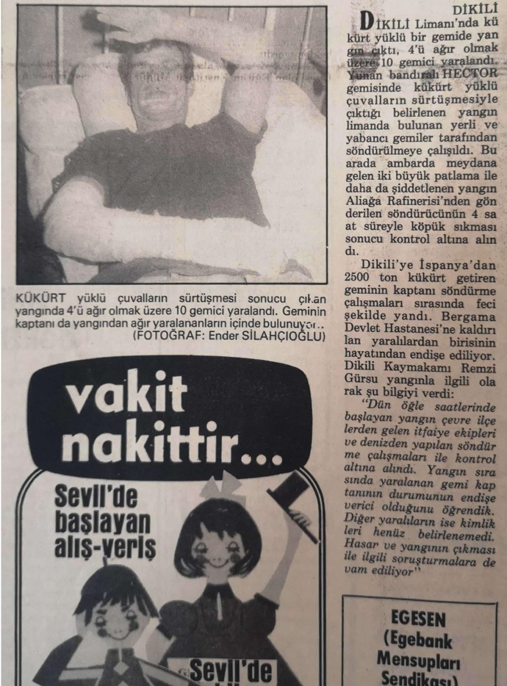 Zeki Çevik; "Ben o gün vinçte görevliydim. Hector adındaki gemi Panama bayraklıydı. Ben vinç operatörüydüm. Kükürtlerin yüklenmesi sırasında bir duman gördüm. Önce uyardım. Ama personel çalışmaya devam etti. Dumanlar iyice artınca müdahale ettiler. O etkiyle patlama oldu. Ben görgü tanıklarına göre vincin üstüne 2 metre yükselmişim, üstüme kapak düşmüş, bayılmışım o an. Gözümü açtığımda Bergama Hastanesi’ndeydim. Köprücük kemiğim kırıldı. En son taburcu olanlardan biriydim" (9 Mart 2021)