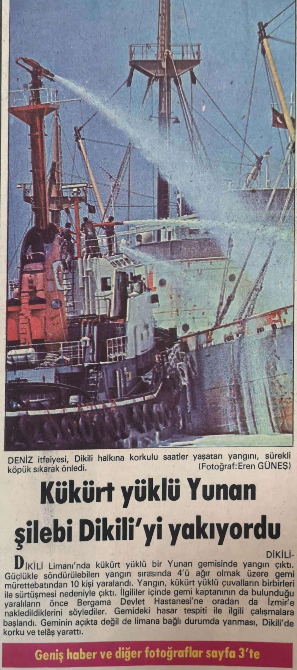Mehmet Güç; "Yanlış hatırlamıyorsam Nisan-Mayıs aylarıydı. Sıcak bir gündü. Evimizin balkonundan olayı bütünüyle gördüm. Önce gemide yangın çıktı. Yanan kükürte su döktüler. O müdahale ile birlikte patlama yaşandı. Havaya uçtu bir kişi. Yangın söndürüldükten sonra gemi 1 yıla yakın Dikili’de şimdiki Yakamoza doğru demirleyerek bekledi. Bir gün fırtınanın etkisiyle Polyak taraflarına sürüklendi. Burada karaya oturdu. Uzun bir süre sonra gemiyi aldılar" (8 Şubat 2021)