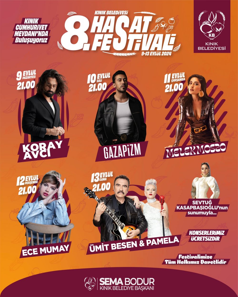 Kınık Belediyesi'nin geleneksel olarak düzenlediği Hasat Festivali bu yıl 8. kez kapılarını açıyor. 9-13 Eylül 2024 tarihleri arasında İzmir'in Kınık ilçesi Cumhuriyet Meydanı’nda gerçekleşecek festival, müzikseverleri bir araya getirmeye hazırlanıyor.