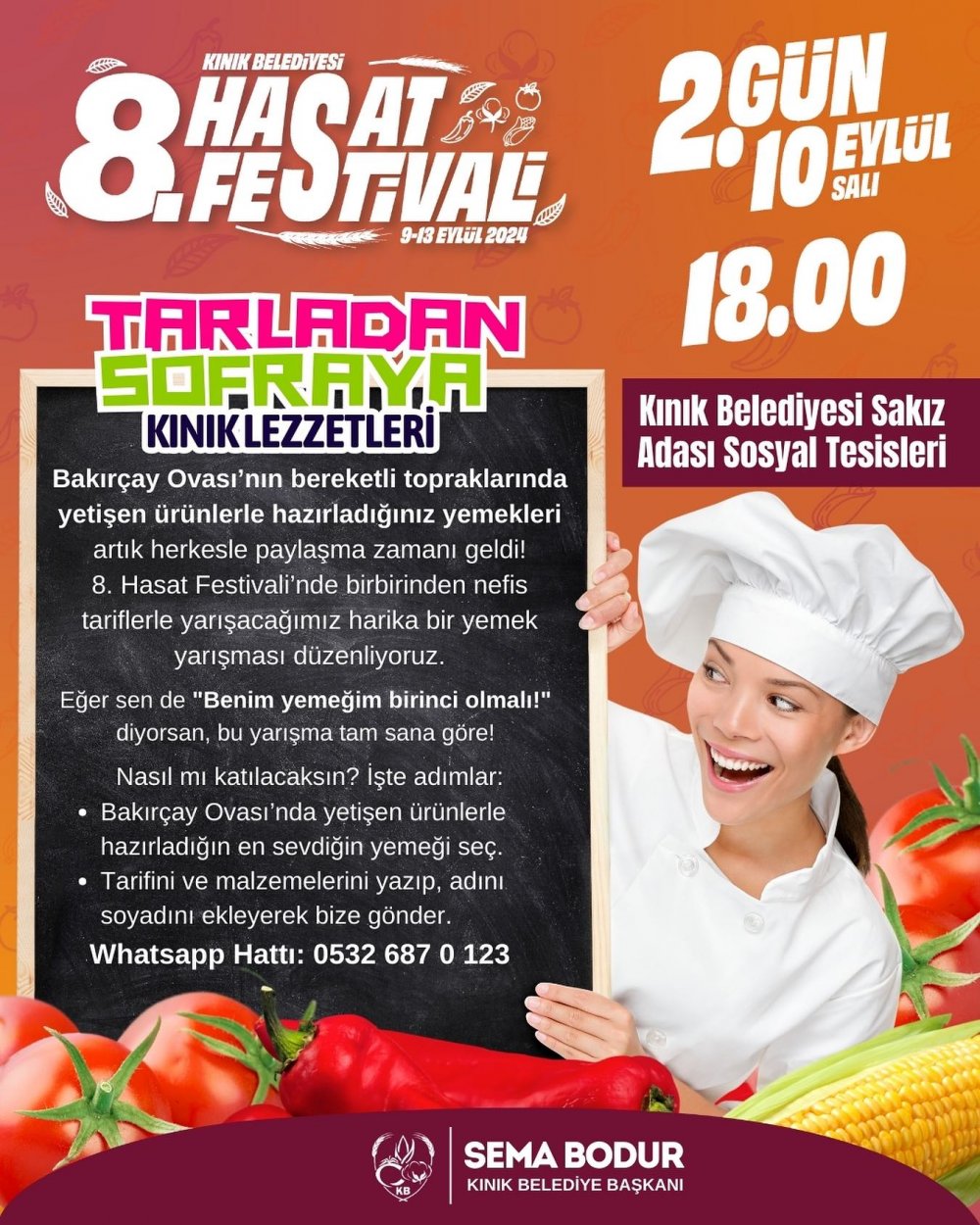 Yarışma ile ilgili yapılan açıklamada; "Bakırçay Ovası’nın bereketli topraklarında yetişen ürünlerle hazırladığınız yemekleri artık herkesle paylaşma zamanı geldi! 8. Hasat Festivali’nde birbirinden nefis tariflerle yarışacağımız harika bir yemek yarışması düzenliyoruz. Eğer sen de 'Benim yemeğim birinci olmalı!' diyorsan, bu yarışma tam sana göre! Nasıl mı katılacaksın? Bakırçay Ovası’nda yetişen ürünlerle hazırladığın en sevdiğin yemeği seç. Tarifini ve malzemelerini yazıp, adını soyadını ekleyerek bize gönder" denildi.