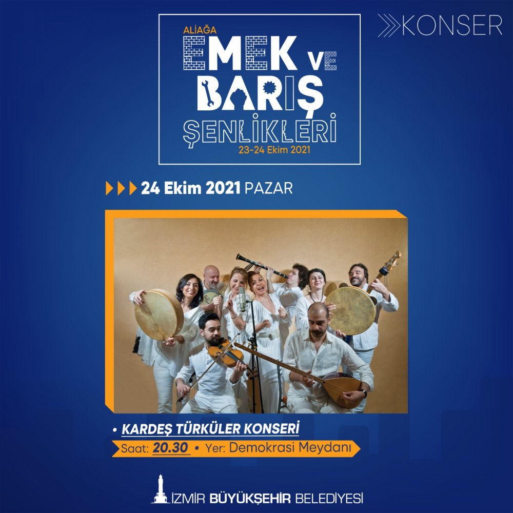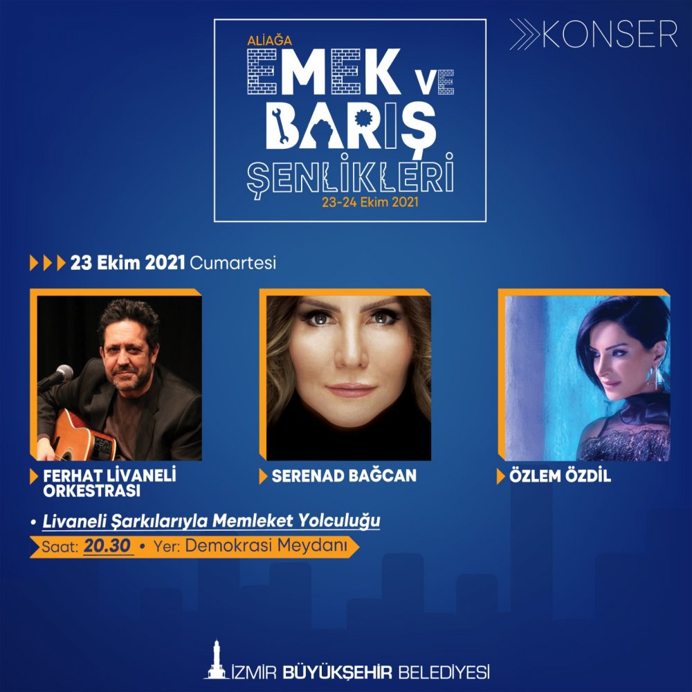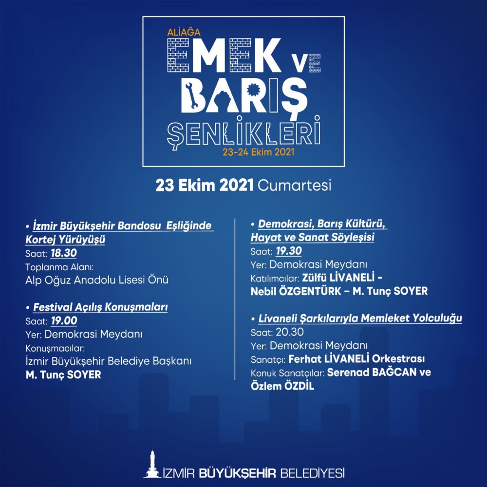İzmir Büyükşehir Belediyesi tarafından Aliağa Emek ve Demokrasi Platformu’nun katkısıyla düzenlenen Aliağa Emek ve Barış Şenlikleri 23 Ekim’de başlıyor. Şenlikler kapsamında panel, söyleşi, şiir dinletisi ve konserler yapılacak.