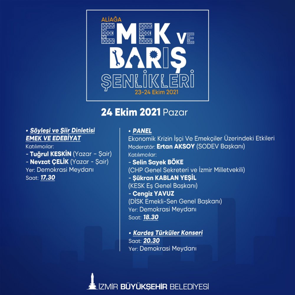 24 Ekim 2021 Pazar saat günü 17.30’da Demokrasi Meydanı’nda, yazar ve şair Tuğrul Keskin, yazar ve şair Nevzat Çelik’in yer alacağı Şiir Dinletisi Emek ve Edebiyat söyleşisi yapılacak. Saat 18.30’da SODEV Başkanı Ertan Aksoy'un moderatörlüğünde, CHP Genel Sekreteri ve İzmir Milletvekili Selin Sayek Böke, KESK Eş Genel Başkanı Şükran Kablan Yeşil ve DİSK Emekli-Sen Genel Başkanı Cengiz Yavuz’un yer alacağı “Ekonomik Krizin İşçi ve Emekçiler Üzerindeki Etkileri” konulu panel düzenlenecek. Aliağa Emek ve Barış Şenlikleri saat 20.30’da başlayacak Kardeş Türküler Konseri ile Demokrasi Meydanı’nda son bulacak.