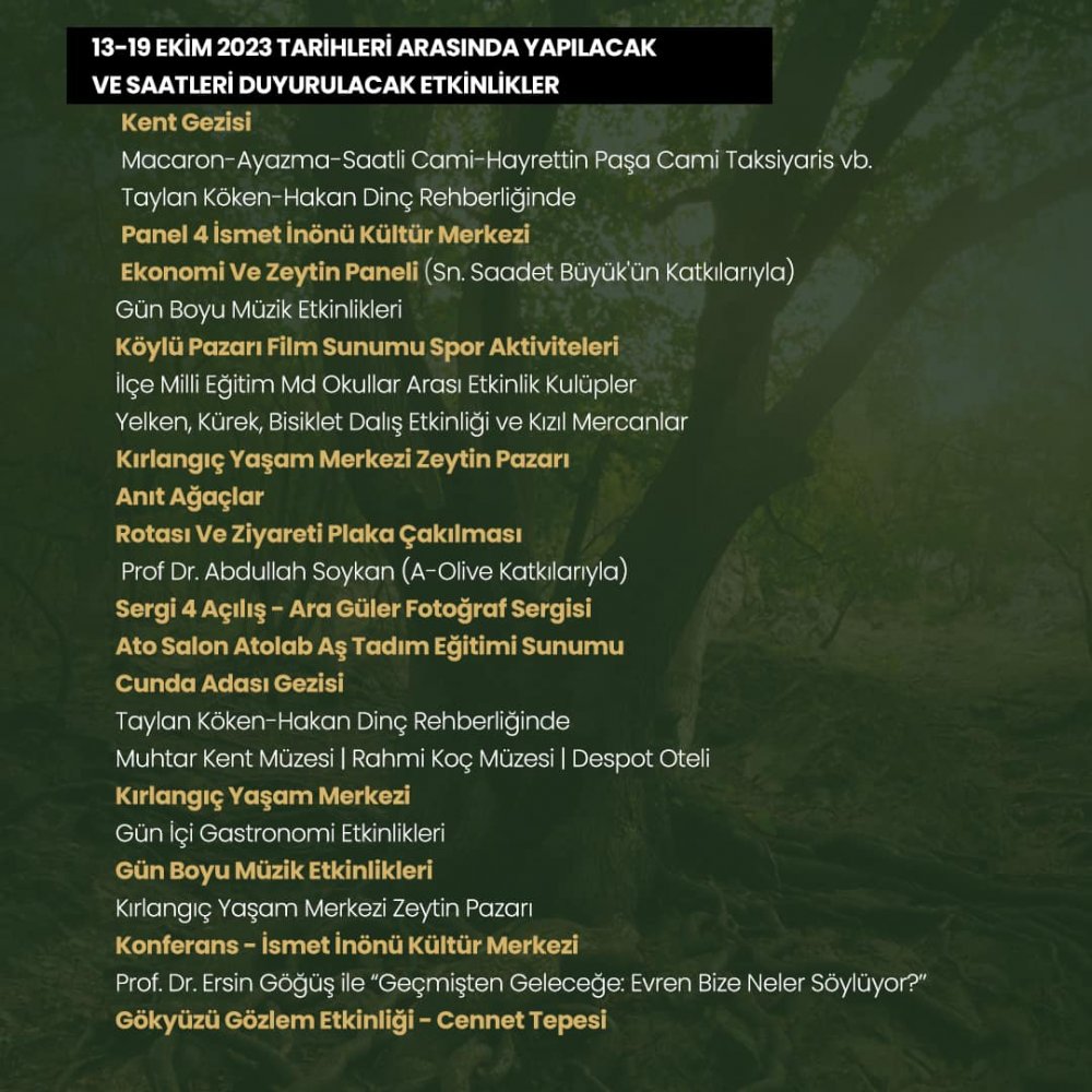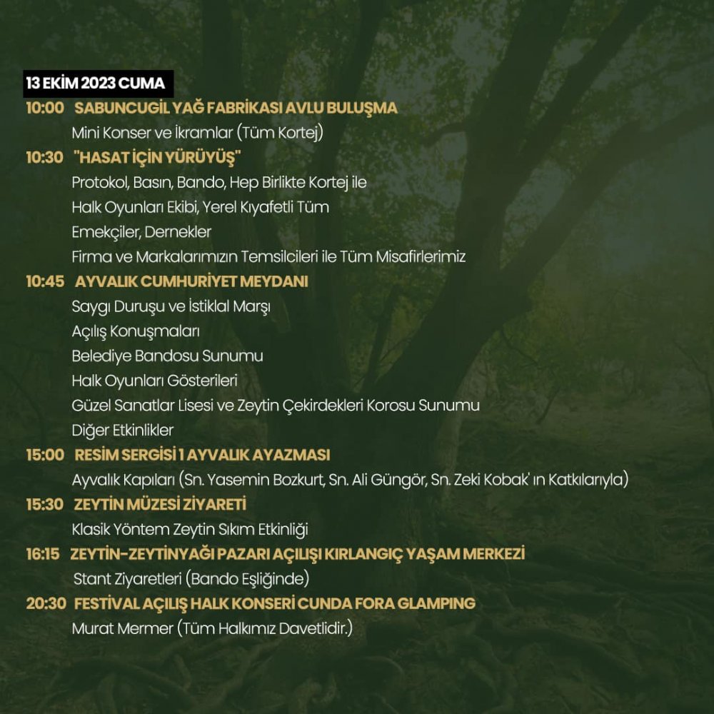 Ayvalık Belediyesi, Balıkesir Büyükşehir Belediyesi, Ayvalık Ticaret Odası ve Balıkesir Ticaret Borsası tarafından düzenlenen 18. Ayvalık Uluslararası Zeytin Hasat Festivali dopdolu bir programla 13 Ekim günü start alıyor.