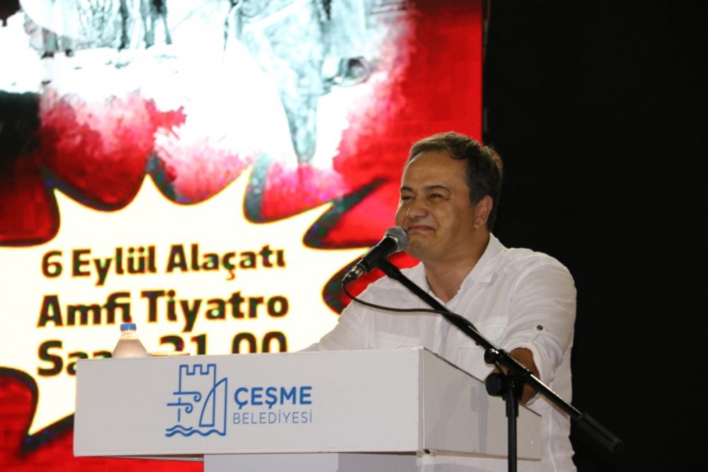 Belgesel sonrası Uğur Dündar’a çiçek vermek için sahneye çıkan Çeşme Belediye Başkanı M. Ekrem Oran, “Uğur Dündar Türkiye’nin yaşayan gerçek efsanesidir ve iyi ki var. Ben bir siyasetçi olarak iyi ki böyle bir öğretmene sahibim. Bu ülkenin Uğur Dündar’lara ihtiyacı var. İyi ki varsınız Uğur Dündar. İyi ki Çeşme’desiniz, iyi ki bizimlesiniz. Efsaneyi belgeselleştirdiği için yol arkadaşım Gökmen Ulu’ya ve emeği geçen herkese teşekkür ediyorum” dedi.