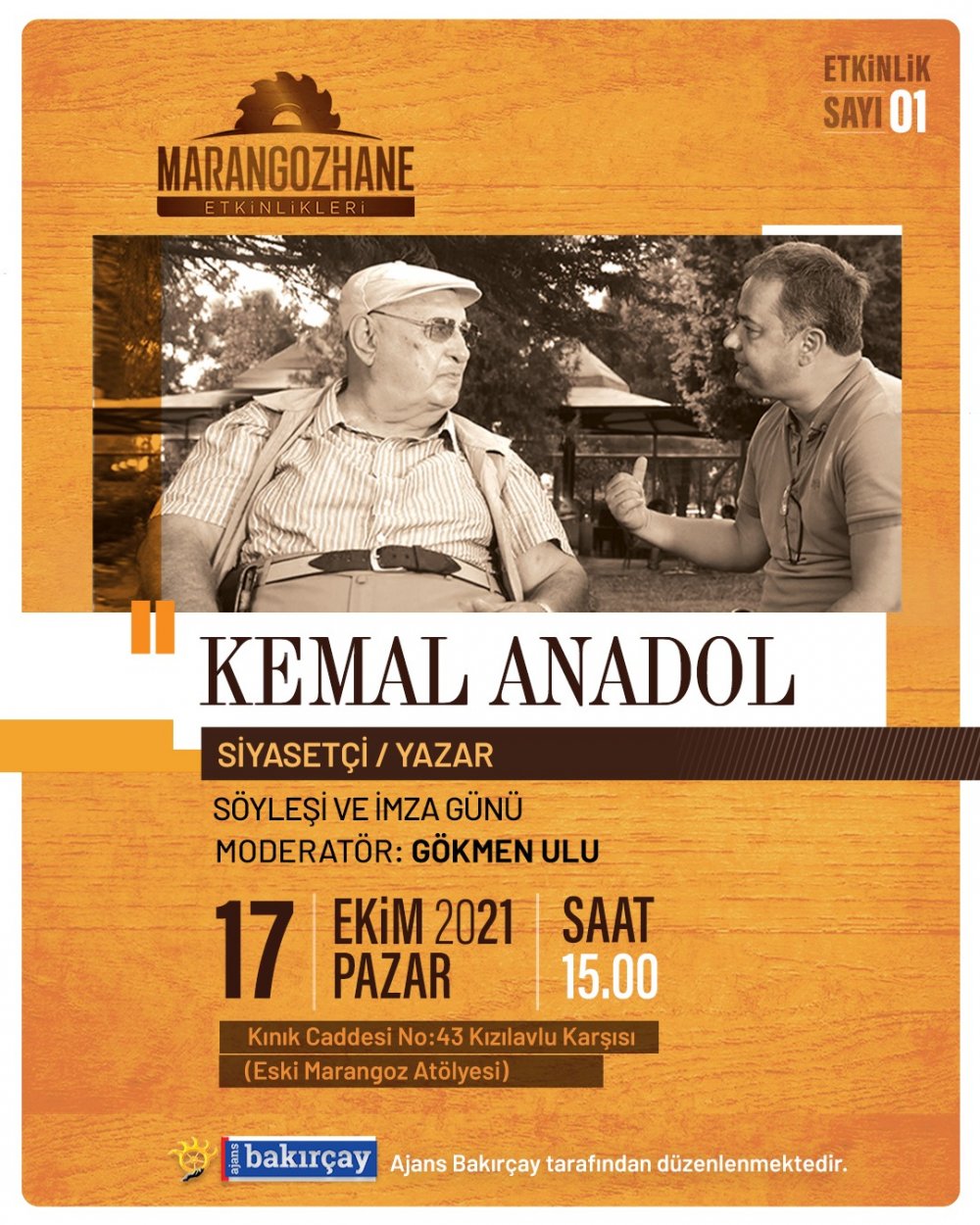 Ajans Bakırçay tarafından düzenlenen Marangozhane Etkinlikleri’nin ilkinde siyasetçi/yazar Kemal Anadol konuk olacak.