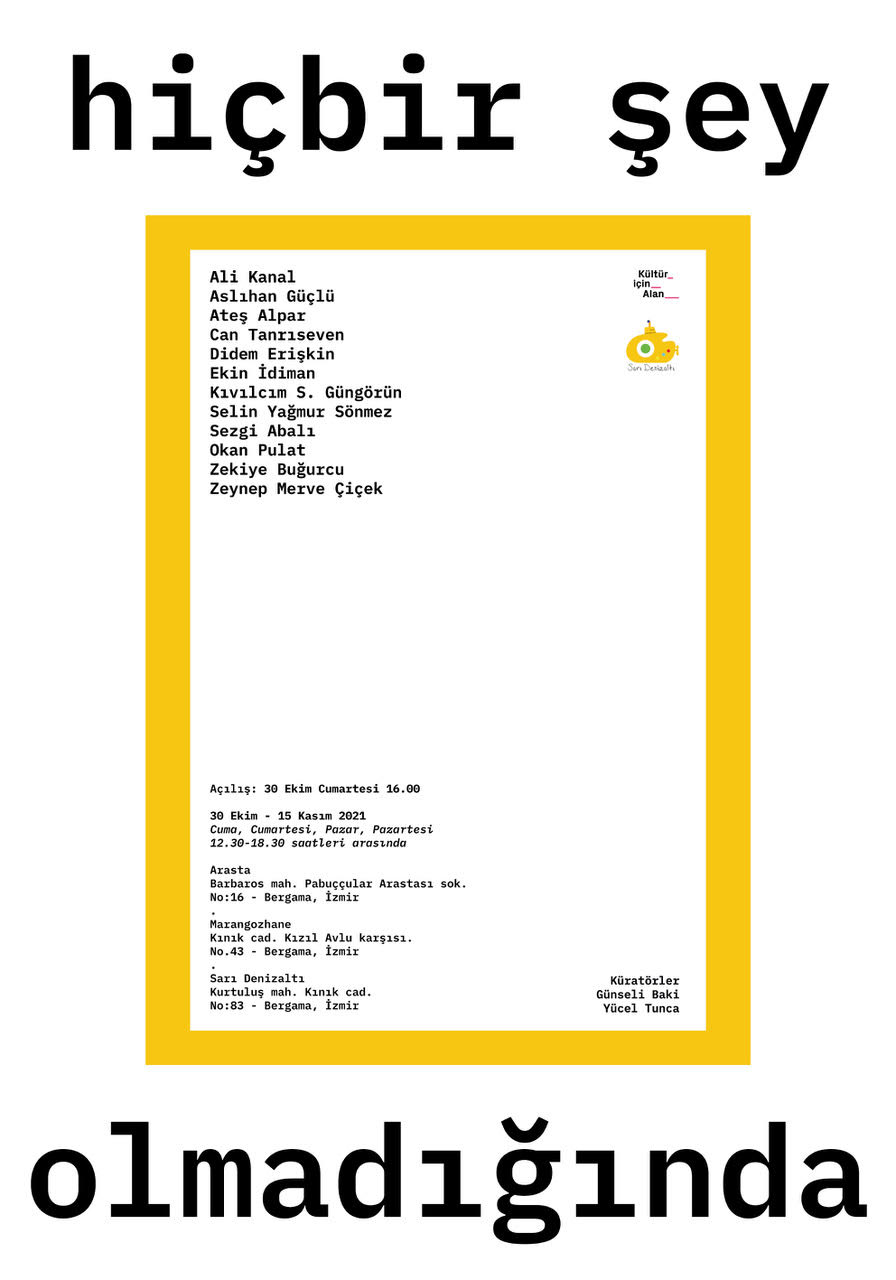 Sarı Denizaltı Sanat İnisiyatifi’nin Kültür için Alan tarafından desteklenen ‘Hiçbir Şey Olmadığında’ güncel sanat projesinin sergisi Ekim ayında Çatı Sanat Alan’ındaki sergisinden sonra Bergama’da 3 farklı mekanda İzmirli müzik grubu Şapkalılar’ın akustik konseri eşliğinde açıldı.