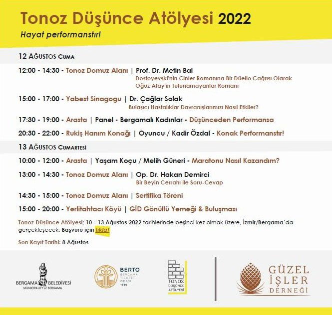 “Dört yıldır, Bergama’nın tarihi dokusu içerisinde, atölye yürütücülerimiz ile interaktif ve disiplinler arası atölyeler gerçekleştiriyoruz. Tonoz Düşünce Atölyesi 2022’nin ya da kısaca TDA’22’in mottosu: ‘Hayat performanstır!’ Kendinizi bu motto içinde ifade etmeye istekli buluyorsanız, bizler sizinle bir arada olmaktan mutluluk duyarız. Çünkü bizim amacımız hem atölye yürütücülerimiz hem de katılımcılarımız için tamamen özgür bir düşünce ortamı yaratmak”