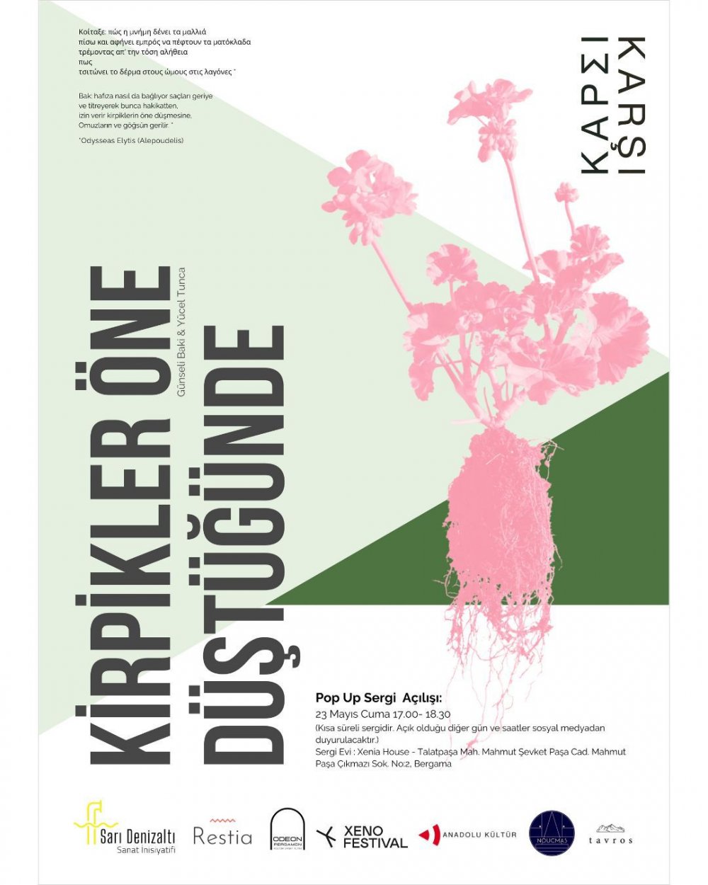 Bu karşılaşmanın herkese açık programı 21 Mayıs’ta "Aynı Sofrada" etkinliği ile başlıyor. 23 Mayıs Cuma günü "Kirpikler Öne Düştüğünde" kısa süreli sergi ve 24 Mayıs Cumartesi günü ise Restia Amke’den Christina-Ino Apostolou & Ioannis Gardiklis ile gerçekleşecek söyleşinin ardından XENO Güncel Sanat Festivali seçkisi olan bir belgesel film, bir kısa film ve bir video çalışması Odeon Pergamon’da gösteriliyor.