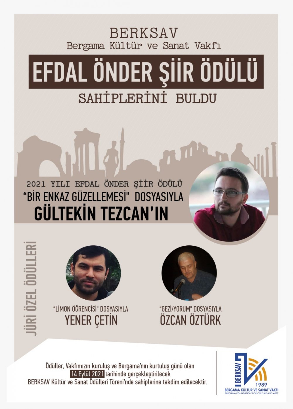 Gültekin Tezcan’ın Efdal Önder Şiir Ödülü’ne değer görülen “Bir Enkaz Güzellemesi” adlı dosyası BERKSAV Kültür Yayınları tarafından yayımlanacak olup ödüller BERKSAV’ın kuruluş, Bergama’nın kurtuluş günü olan 14 Eylül tarihinde düzenlenecek törenle sahiplerine takdim edilecek.