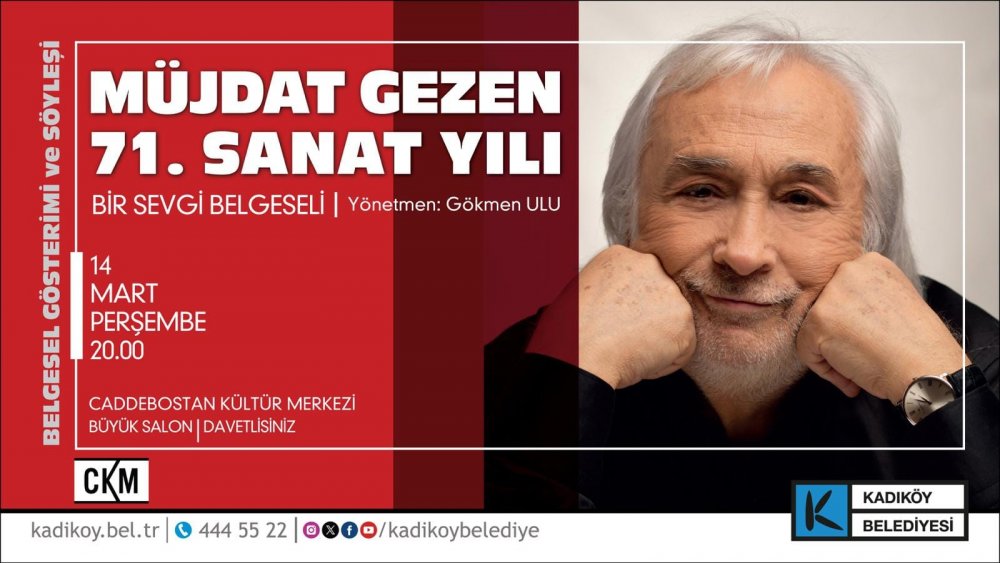 Türkiye’nin insan hazinelerinden Müjdat Gezen’in 71. sanat yılını kutlamak için sevenleri bir araya geliyor. Müjdat Gezen belgeseli gösterimi ve söyleşinin gerçekleştirileceği etkinlikte usta sanatçının ailesi, arkadaşları, öğrencileri de yer alacak.