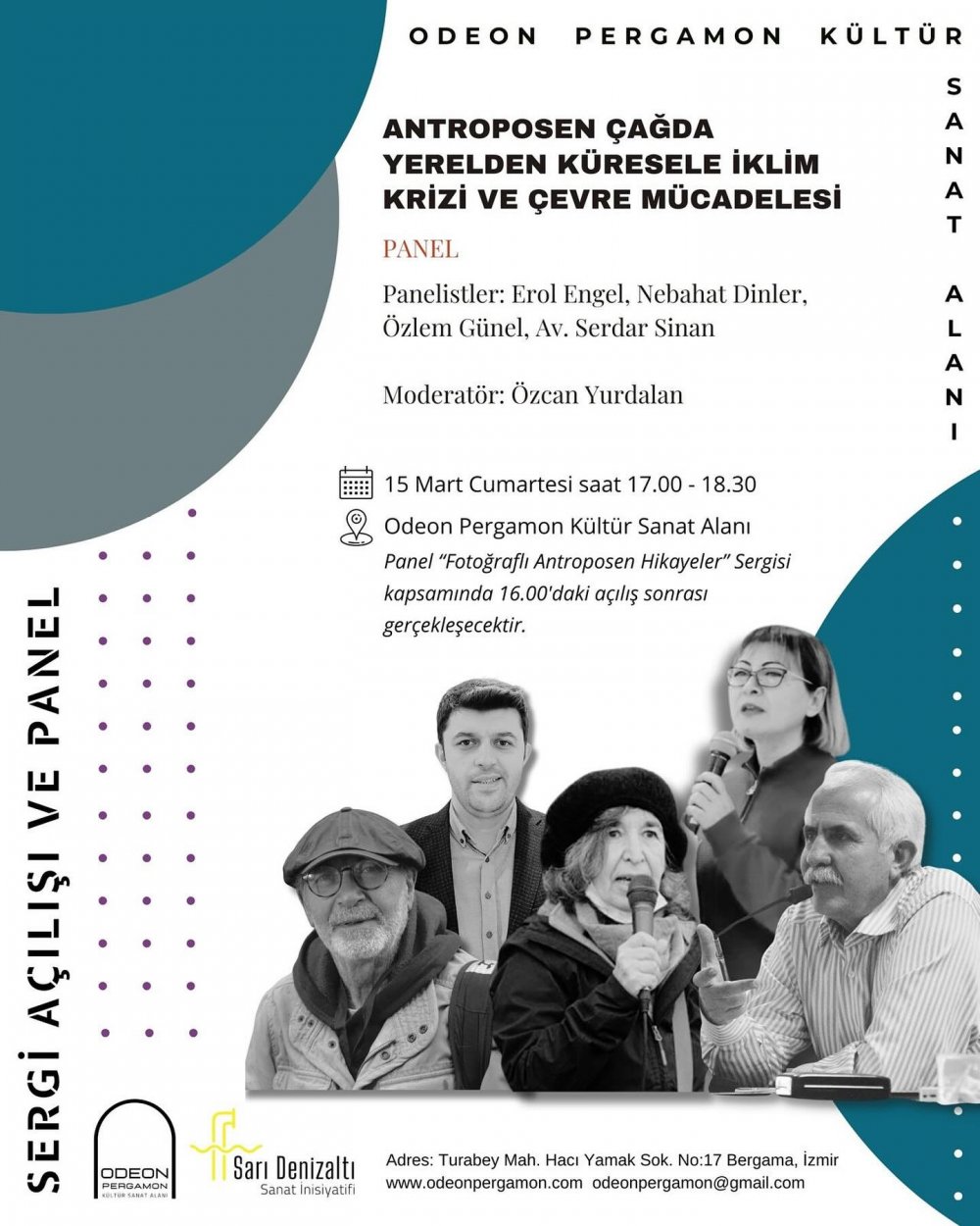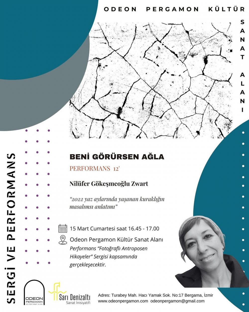 15 Mart Cumartesi günü, saat 16.00’da Odeon Pergamon’nda açılacak olan sergi 24 Mart’a kadar görülebilecek. Sergi kapsamında 15 Mart Cumartesi günü saat 16.45'te Nilüfer Gökeşmeoğlu Zwart’ın 2022 yılının yaz aylarında yaşanan kuraklığın masalımsı anlatımını içeren “Beni Görürsen Ağla” adlı performansı da gerçekleştirilecek. Saat 17.00'de ise “Antroposen Çağda Yerelden Küresele İklim Krizi ve Çevre Mücadelesi” adlı bir panel yapılacak. Panelin moderatörlüğü, projenin yürütücülerinden Özcan Yurdalan üstlenirken panelde, Bergama Çevre Platformu sözcüsü Erol Engel, Ayvalık Tabiat Platformu sözcüsü Nebahat Dinler, belgesel fotoğrafçı Özlem Günel ve avukat Serdar Sinan konuşmacı olarak yer alacak.