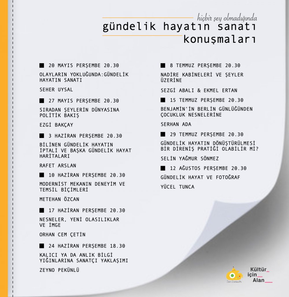 Sergiye bir zemin ve diyalog ortamı oluşturması amaçlanan “Hiçbir Şey Olmadığında, Gündelik Hayatın Sanatı Konuşmaları” ise Mayıs ayından Ağustos başına kadar her perşembe akşamı çevrimiçi yapılacak. Konuşmalar serisine davetli sanatçılar; Seher Uysal, Ezgi Bakçay, Rafet Arslan, Metehan Özcan, Orhan Cem Çetin, Zeyno Pekünlü, Ekmel Ertan, Sezgi Abalı, Serhan Ada, Selin Yağmur Sönmez ve Yücel Tunca’nın kendi sanatsal pratiklerini ve gündelik hayat bağlamında sanat ilişkisini anlatacağı sunumlar herkese açık olarak gerçekleşecek.