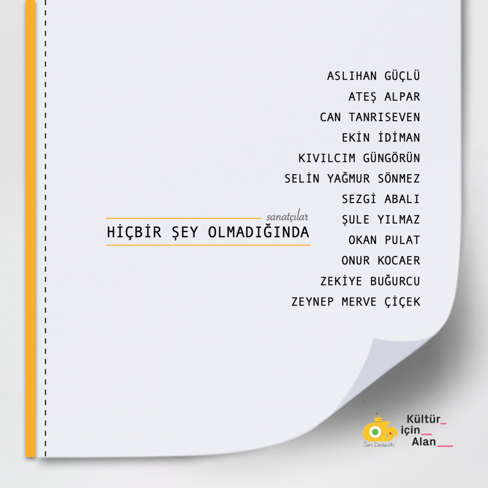 Sarı Denizaltı Sanat İnisiyatifi’nin yeni güncel sanat projesi “Hiçbir Şey Olmadığında”, Georges Perec’in “Hiçbir şey olmadığında ne oluyor?” sorusundan yola çıkıyor. Gündelik hayatımızda önemsiz ve değersiz görünen, bizi şaşırtmayı bırakmış şeyleri, aleladeyi, sıradanı sorgulamak üzere gündelik hayatın kendi dinamiği ve ritmi içinde günümüz koşullarında giderek daralan hayatımıza yeniden bakmayı deniyor.