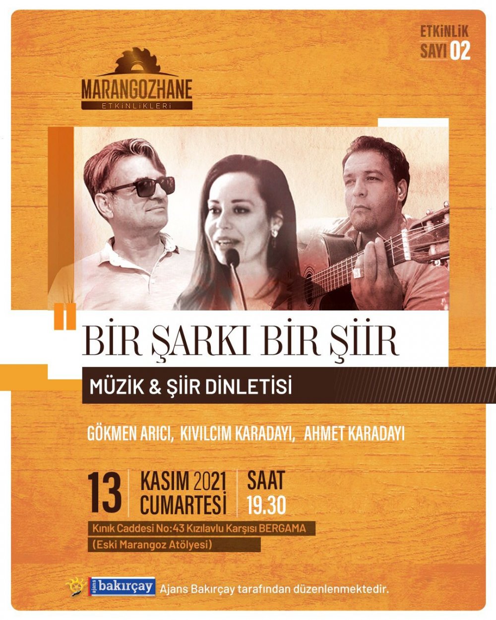İzmir’in deneyimli sunucularından Kıvılcım Erdem Karadayı ve müzisyenler Gökmen Arıcı ile Ahmet Karadayı’nın yer alacağı ‘Bir Şarkı, Bir Şiir’ isimli dinleti 13 Kasım 2021, Cumartesi günü saat 19.30’da yine Marangozhane’de gerçekleştirilecek.