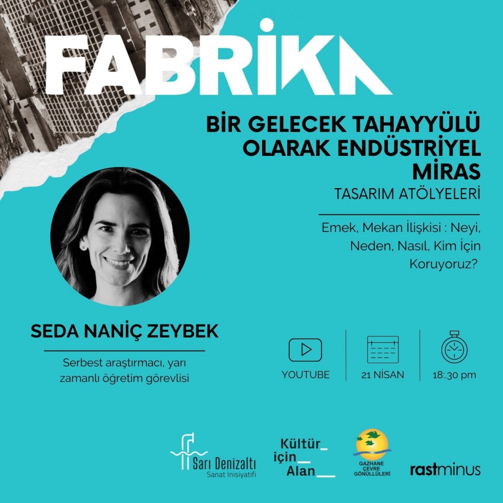 FABRİKA “Bir Gelecek Tahayyülü Olarak Endüstriyel Miras” Tasarım Atölyeleri, 21 Nisan Perşembe YouTube'ta, Araştırmacı ve yarı zamanlı öğretim görevlisi Seda Naniç Zeybek'in 'Emek - Mekân İlişkisi - Neyi, Neden, Nasıl ve Kim İçin Koruyoruz?' ile başladı.