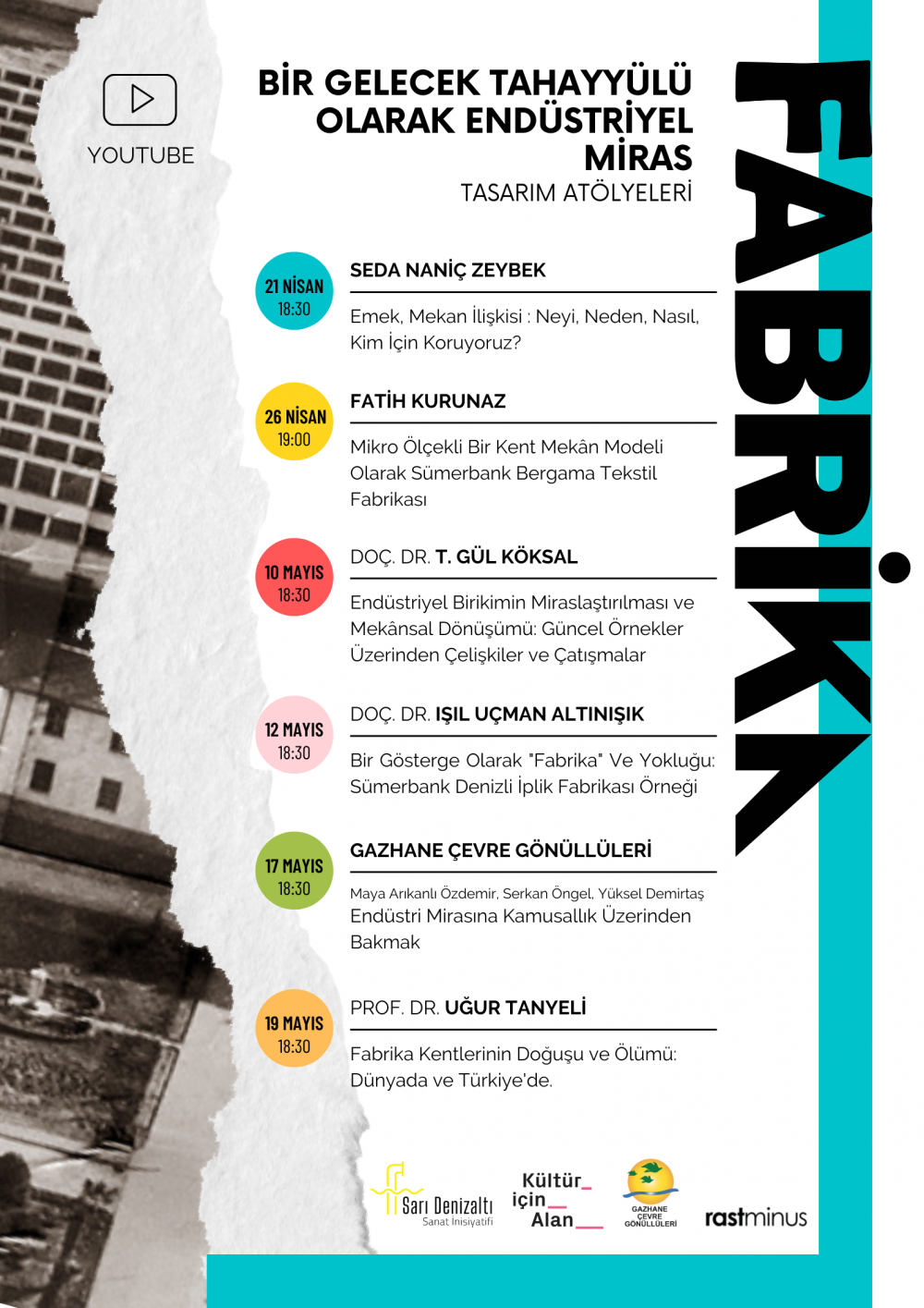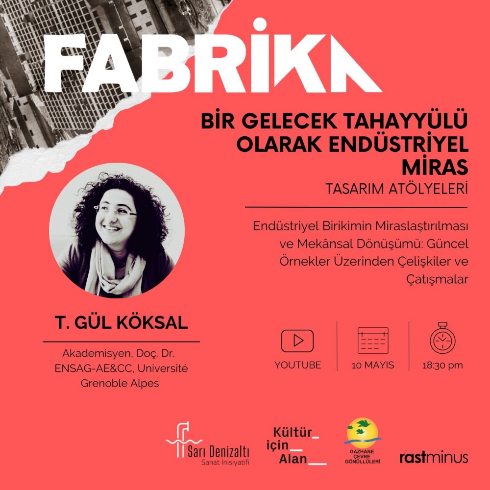 17 Mayıs Salı 18.30 - Endüstri Mirasına Kamusallık Üzerinden Bakmak Gazhane Çevre Gönüllüleri; Maya Arıkanlı Özdemir, Serkan Öngel, Yüksel Demirtaş
