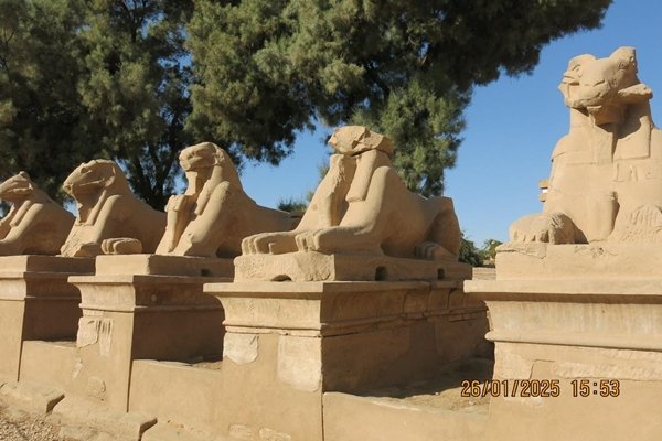 Tanrı Amun’a adanmış koç başlı sfenksli yoldan giriliyor tapınağa.