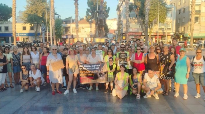 "İzmir Dikili'de kimseye bir zararı olmayan sokak köpekleri toplatıldı ve kapatıldıkları yerde sıcaktan, havasızlıktan öldüler. Katledildiler. Yine İzmir'de denize girdiği için CİMER'e şikayet edilen sokak köpeği Ares barınağa kapatıldı, hastalık kapıp öldü. Katledildi. AKP iktidarı 'Katliam Yasası'yla nefes alan tüm canlılar için ölüm fermanı çıkarırken toplumsal çürüme ve suç ortakları yarattı. Bu katliamların faili siyasi iktidardır! Yeter artık! Yarattığınız katliam düzeninin katliam yasaları memleketi koyu bir karanlığa sürüklüyor. Çekin kanlı ellerinizi hayvanların üzerinden!"