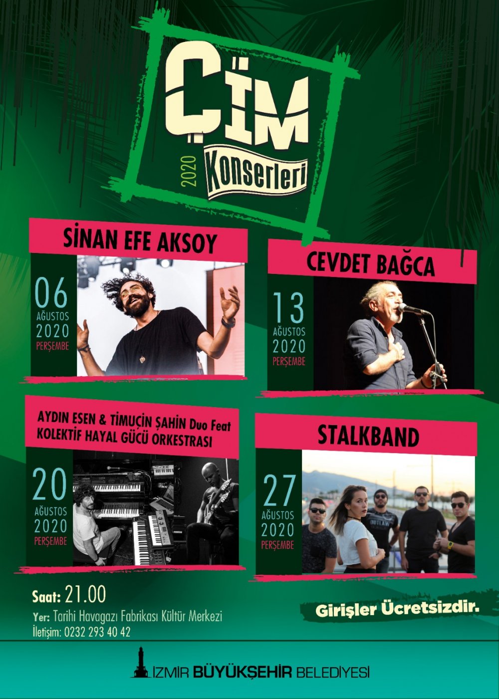 Çim Konserleri 13 Ağustos 21.00’de Cevdet Bağca, 20 Ağustos 21.00’de Aydın Esen & Timuçin Şahin Duo Feat Kolektif Hayal Gücü Orkestrası ve 27 Ağustos 21.00’de Stalkband ile devam edecek.