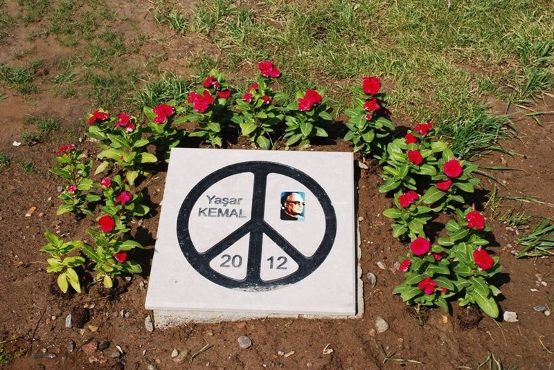 * Büstün sağ tarafındaki yeşil alana üzerinde barışın simgesi ve Yaşar Kemal’in resmi olan mermer tabaka konulmuştur.
