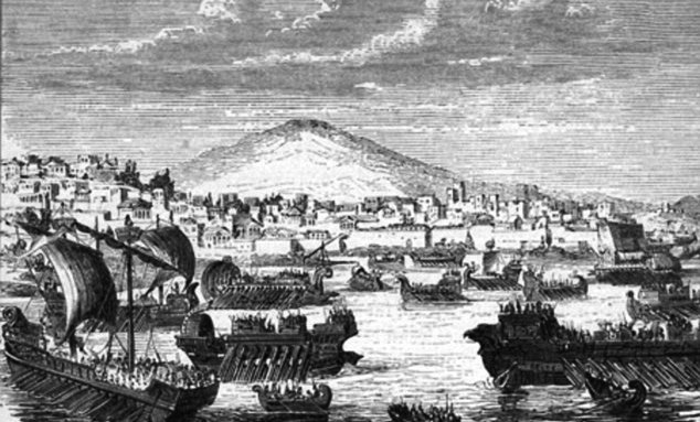 FOTO: Arginusae Muharebesi, KANE Antik Kenti önünde Sparta filosu.. Peloponez Savaşı'ndaki en büyük deniz savaşlarından biri olarak kabul edilir.. (Syracuse, Sicilya dışında bir gravürde resmedilmiştir)
