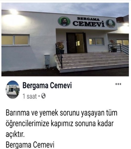 Bergama'da 2019 yılında hizmete açılan Bergama Cemevi, kapılarını barınma ve yemek sorunu yaşayan öğrencilere açtığını duyurdu.