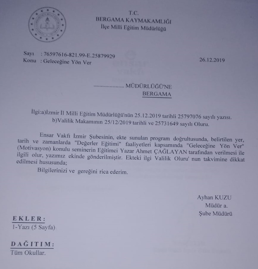 İzmir Valiliği, Ensar Vakfı İzmir Şubesi’nin “Değerler Eğitimi” faaliyetleri kapsamında “Geleceğine Yön Ver” konulu seminer verilmesiyle ilgili talebini onayladı. Bergama İlçe Milli Eğitim Müdürlüğü’ne konuyla ilgili olur yazısını gönderdi. İlçe Milli Eğitim Müdürlüğü ise Bergama’da bulunan tüm okullarda bu uygulamaya izin verdi. Duruma Bergama Demokrasi Platformu yaptığı basın açıklaması ile tepki gösterdi.