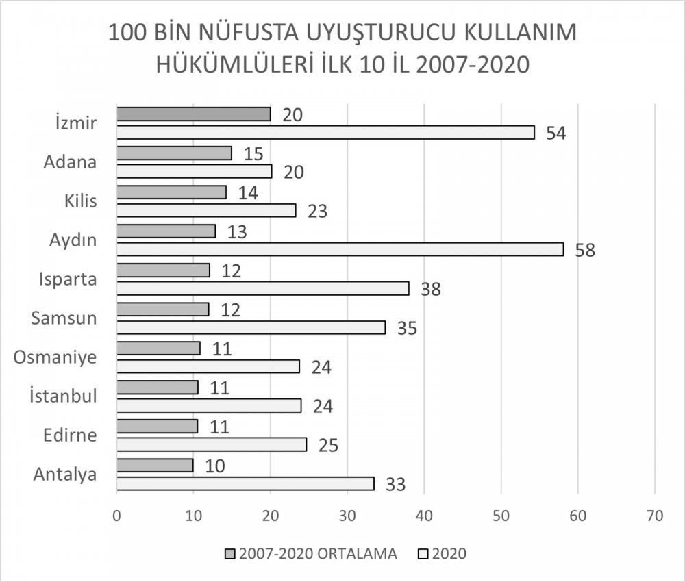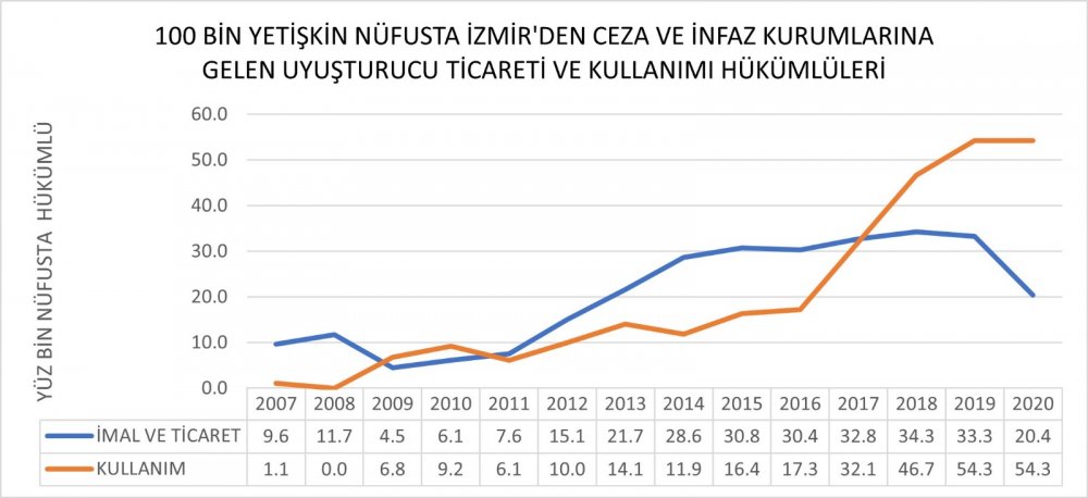 Evet, kısıtlı verilere rağmen İzmir’deki durumu destekleyen başka veriler de var. TÜİK’in Adalet Bakanlığı istatistiklerine dayanarak suç işlenen illere göre ceza ve infaz kurumlarına gelen hükümlü sayıları, yetişkin nüfusa oranlandığında İzmir uyuşturucu kullanım suçlarında 2007-2020 arasındaki 14 yıllık dönemde ortalama yüz bin nüfusta 20 hükümlüye sahip ki bu 2020 yılında yüz binde 54 olmuş. Yine imal ve ticaret suçlarında da 14 yılın ortalaması yüz bin nüfusta 20 hükümlüyle 18. sırada.