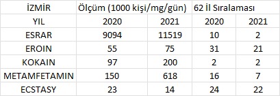 Buna kesin bir cevap vermek güç, çünkü göz önüne alınması gereken çok faktör var. İzmir pandemi sonrası en çok göç alan illerden biri, turizmin yoğun olduğu bir şehir, bunun dışında yoğun bir sanayii ve buna bağlı çalışan nüfus var. İşsizlik ve tarıma elverişli toprakların azalmasının yoğun hissedildiği bir şehir. Ayrıca İzmir’in komşuları Balıkesir, Aydın, Muğla, Denizli, Uşak gibi yoğun uyuşturucu tüketimi, ticareti ve organize suç faaliyeti olan illerle de ilişki içinde. Zaten tüketimin kaba haritasına bakıldığında Urfa-Antep-Mersin hattından İzmir’e kadar olan bütün coğrafyada şaşırtıcı ve yaygın bir tüketim var. Bunun üzerine daha kapsamlı araştırmaların yapılması da gerekiyor.