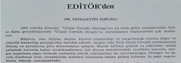 Fotoğraf 4. Ulusal Cerrahi Dergisinin 1985 yılında yayınlanan ilk sayısında Prof. Dr. Cemalettin Topuzlu (Editör) tarafından yazılan, “başlangıç” yazısı (Ulusla Cerrahi Dergisi 1985;1(1):-